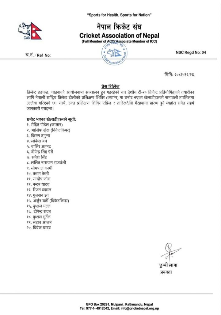 बन्द प्रशिक्षणमा बोलाइएका खेलाडी : रोहित पौडेल (कप्तान), आसिफ शेख, किरण ठगुन्ना, लोकेश बम, वसिर अहमद, दीपेन्द्रसिंह ऐरी, रुपेश सिंह, ललितनारायण राजवंशी, सोमपाल कामी, करण केसी, सन्दीप जोरा, नन्दन यादव, रिजन ढकाल, गुल्शन झा, अर्जुन घर्ती, कुशल मल्ल, दीपेन्द्र रावत, कुशल भुर्तेल, शहाब आलम र विवेक यादव ।