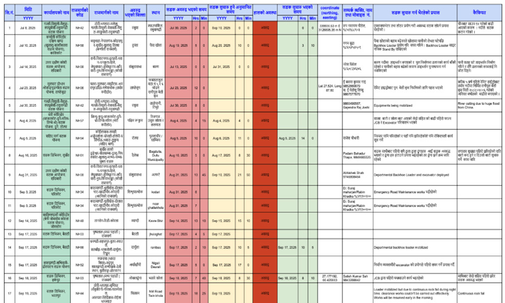 सुर्खेत, सङ्खुवासभा, सिन्धुपाल्चोक,म्याग्दी, बैतडी, अर्घाखाँची, ओखलढुङ्गा, चितवनका विभिन्न सडक खण्ड पहिरोको कारण अवरुद्ध छन् ।