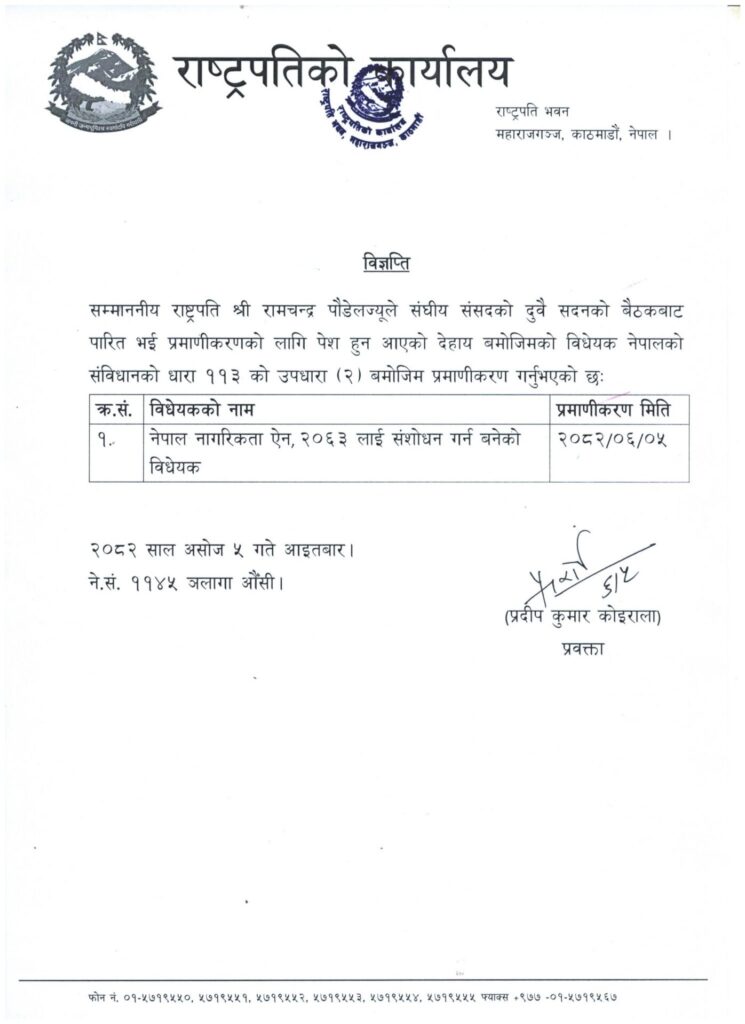 काठमाडौं । राष्ट्रपति रामचन्द्र पौडेलले नेपाल नागरिकता ऐन २०६३ लाई संशोधन गर्न बनेको विधेयक प्रमाणीकरण गरेका छन् ।