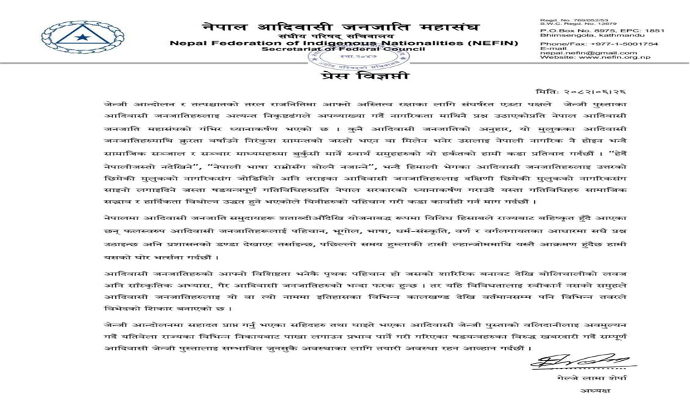 काठमाडौं । जेन्जी आन्दोलन र तत्पश्चातको तरल राजनितिमा आफ्नो अस्तित्व रक्षाका लागि संघर्षरत एउटा पक्षले जेन्जी पुस्ताका आदिवासी जनजातिहरुलाइ अत्यन्त निकृष्टढंगले अपव्याख्या गर्दै नागरिकता माथिनै प्रश्न उठाएकोप्रति नेपाल आदिवासी जनजाति महासंघको गंभिर ध्यानाकर्षण भएको जनाएकाे छ । कुनै आदिवासी जनजातिको अनुहार, यो मुलुकका आदिवासी जनजातिहरुमाथि क्रुरता वर्षाउने निरंकुश सामन्तको जस्तो भएन वा मिलेन भनेर उसलाइ नेपाली नागरिक नै होइन भन्दै सामाजिक सञ्जाल र सञ्चार माध्यमहरुमा बुर्कुसी मार्ने स्वार्थ समुहहरुको यो हर्कतको हामी कडा प्रतिवाद गर्दछौं ।