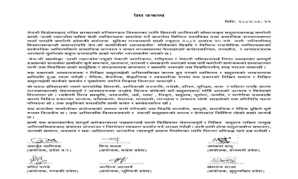 जेन–जी सहयोद्धा ‘टासी ल्हान्जोम’ज्यूको नेपाली नागरिकता, राष्ट्रियता र नेपाली पहिचानलाई लिएर उठाइएका भ्रमपूर्ण प्रश्नहरुको सन्दर्भमा हामीसँग कुनै समन्वय, छलफल, परामर्श र समझदारी नभएको स्पष्ट पार्दै कर्णाली संयोजकको हस्ताक्षारमा जारी उक्त विज्ञप्तिमा हाम्रो सामुहिक र संगठनात्मक संलग्नता र सहमति नभएको यस विज्ञप्तिमार्फत् स्पष्ट गराउन चाहन्छौं । यस प्रकारको अपमानजनक र निश्चित समुदायद्वेषी अभिव्यक्तिका कारण हुन गएको व्यक्तिगत र समुदायको भावनात्मक क्षतिप्रति दुःख व्यक्त गर्दछौं । नैतिक, वैचारिक, सैद्धान्तिक र व्यवहारिक रूपमा यस प्रकारको निश्चित समाज र निश्चित समुदायद्वेषी कार्यको समर्थन र पृष्ठपोषण नगरिने विश्वास दिलाउन चाहन्छौं ।