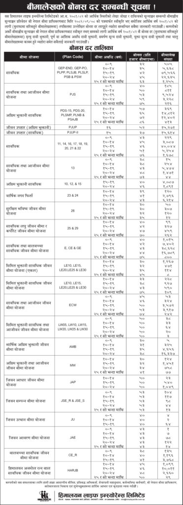 नयाँ बोनसदर अनुसार बीमितले बीमालेख र बीमा अवधि अनुसार न्यूनतम ३० रुपैयाँदेखि अधिकतम ८६ रुपैयाँसम्म बोनस पाउने भएका छन्। यो बोनसदर मुनाफामा सरिक हुने बीमालेखहरूमा लागू हुने र अर्काे बीमांकीय मूल्यांकन स्वीकृत नभएसम्म मृत्यु दाबी भुक्तानी, पूर्ण वा आंशिक अवधि दाबी भुक्तानी, समर्पण मूल्य दाबी भुक्तानी, चुक्ता मूल्य दाबी भुक्तानी तथा चालू बीमालेखहरूमा पनि कायम रहने कम्पनीले स्पष्ट पारेको छ ।