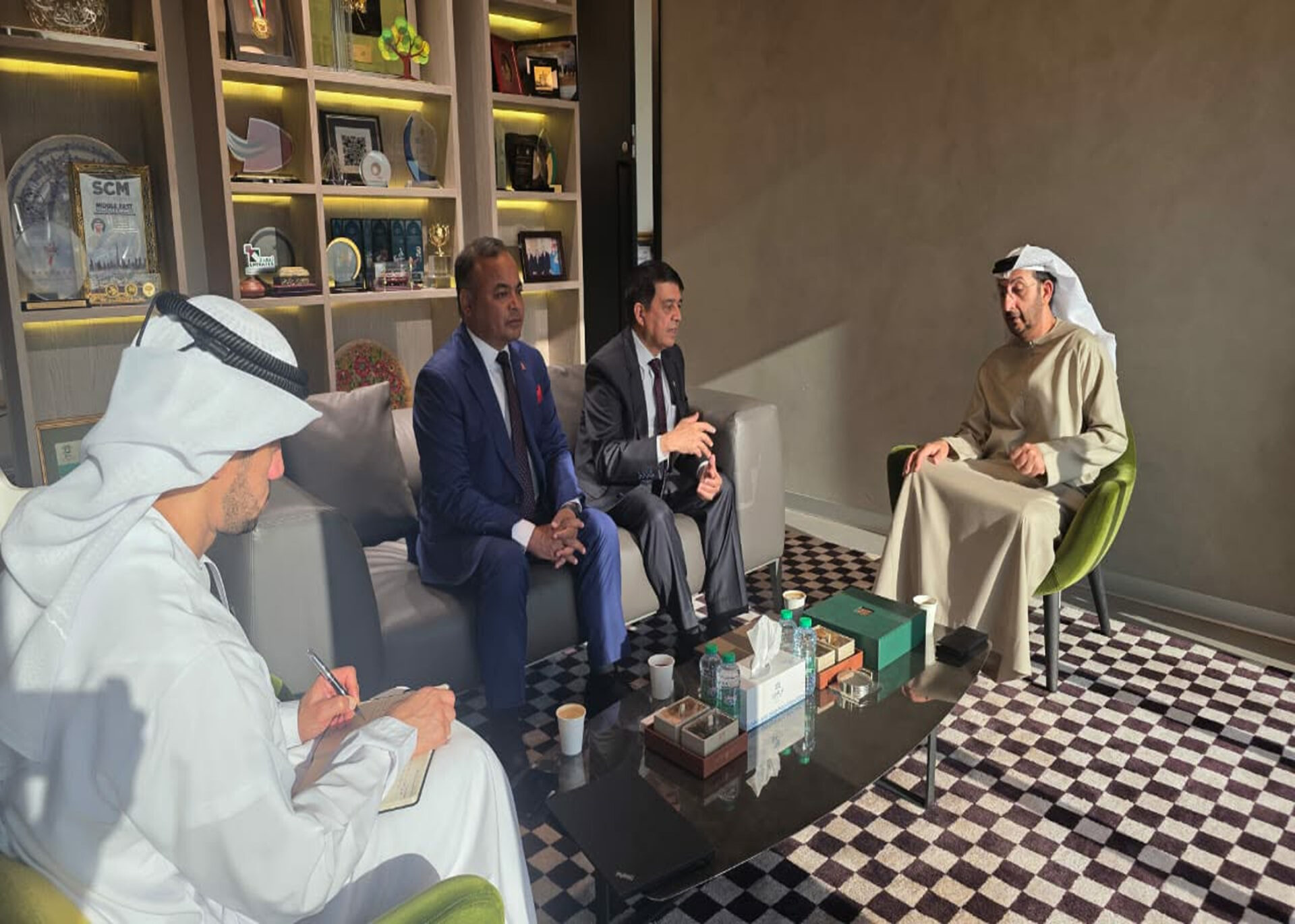 संयुक्त अरब इमिरेट्स (यूएई) का लागि नेपाली महामहिम राजदूत तेजबहादुर क्षेत्रीको उपस्थितिमा सम्पन्न भेटवार्तामा दुवै पक्षले आगामी दिनमा नेपाल–यूएई आर्थिक सहकार्यलाई थप प्रभावकारी बनाउँदै पारस्परिक लाभका साझेदारीहरू अघि बढाउने प्रतिबद्धता व्यक्त गरेका छन् । सो अवसरमा महासंघका अध्यक्ष ढकालले नेपालमा रहेको लगानी सम्भावनाबारे जानकारी गराउँदै निजी क्षेत्रबीचको सहकार्यलाई थप मजबुत बनाउनुपर्नेमा जोड दिए । उनले नेपालमा जलविद्युत्, पर्यटन, कृषि प्रशोधन, ठूला पूर्वाधार तथा सूचना प्रविधि (आईटी) जस्ता प्राथमिकता प्राप्त क्षेत्रमा व्यापार तथा लगानी सहकार्य विस्तार गर्ने सकिनेमा जोड दिए । साथै उनले काठमाडौंका लागि एमिरेट्स एयरलाइन्सको प्रत्यक्ष उडान सुरु हुनु पर्यटन, व्यापार र समग्र व्यावसायिक आवागमन बिस्तारका लागि अत्यन्त महत्वपूर्ण हुने उल्लेख गरे ।