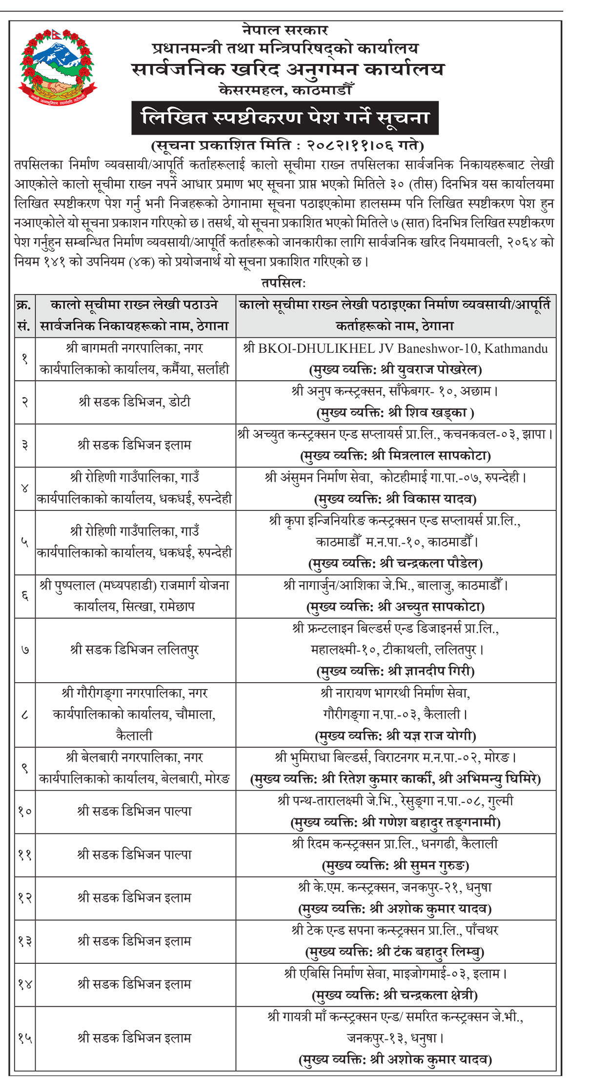 निर्धारित समयसीमाभित्र निर्माण कार्य सम्पन्न नगरेको आरोपमा कार्यालयले यसअघि सम्बन्धित कम्पनीहरूलाई ३० दिनभित्र कारणसहित स्पष्टीकरण पेश गर्न निर्देशन दिएको थियो । तर, तोकिएको अवधिमा स्पष्टीकरण नआएपछि कार्यालयले बुधबार पुनः सात दिनको थप समय प्रदान गरेको जनाएको छ ।
