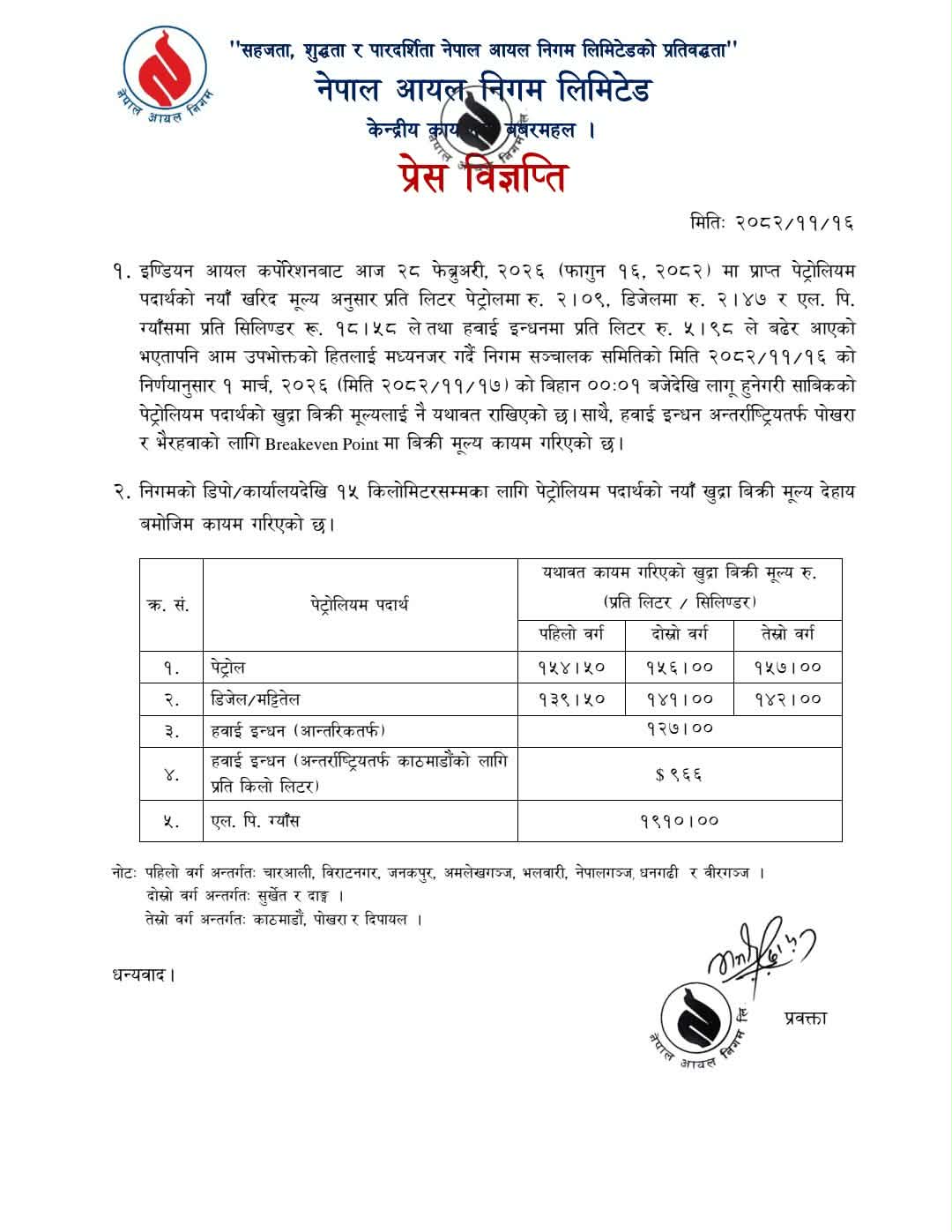 निगमका अनुसार फागुन १६ गते प्राप्त नयाँ खरिद मूल्यसूचीअनुसार पेट्रोल, डिजेल र एलपी। ग्यासको मूल्य बढेर आएको छ । पेट्रोलमा प्रतिलिटर २.१०, डिजेलमा २.४६ र एलपी ग्यासमा प्रतिसिलिन्डर १८.५८ रुपैयाँले वृद्धि भए पनि निगमले मूल्यवृद्धि नगरी मूल्य यथावत् राखेको छ । याे मूल्य फागुन १७ गते  बिहान १ बजेदेखि लागू हुने छ ।