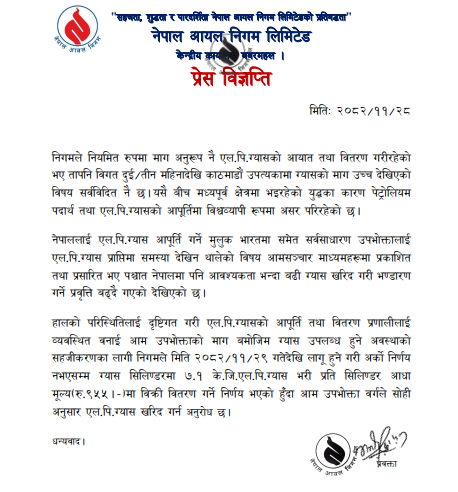 निगमका अनुसार नियमित रूपमा मागअनुसार ग्यास आयात र वितरण भइरहे पनि पछिल्ला दुई/तीन महिनादेखि ग्यासको माग असामान्य रूपमा बढेको छ। निगमले आपूर्ति तथा वितरण प्रणालीलाई व्यवस्थित बनाउन अस्थायी रूपमा ७.१ केजी ग्यास भरेर प्रतिसिलिन्डर ९५५ रुपैयाँमा बिक्री गर्ने निर्णय गरिएको हो। साथै उपभोक्तालाई अनावश्यक रुपमा ग्यास भण्डारण नगर्न र आवश्यकताअनुसार मात्र खरिद गर्न निगमले विज्ञप्तिमार्फत आग्रह गरेको छ।