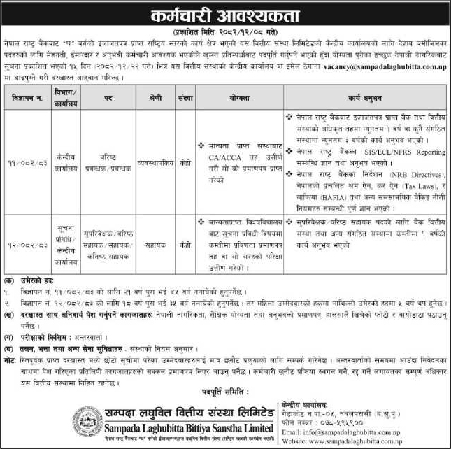 संस्थाले वरिष्ठ प्रबन्धक/प्रबन्धक पदमा केही संख्यामा कर्मचारी माग गरेको छ। यो पद व्यवस्थापकीय श्रेणीअन्तर्गत केन्द्रीय कार्यालयका लागि खुलाइएको हो। यस पदका लागि मान्यता प्राप्त संस्थाबाट सीए/एसीसीए तह उत्तीर्ण गरी सम्बन्धित प्रमाणपत्र प्राप्त गरेको हुनु पर्नेछ। साथै नेपाल राष्ट्र बैंकबाट इजाजतपत्र प्राप्त बैंक तथा वित्तीय संस्थाको अधिकृत तहमा कम्तीमा १ वर्ष र कुनै संगठित संस्थामा कम्तीमा ३ वर्षको कार्यानुभव आवश्यक हुनेछ। एनआरबी डाइरेक्टिभ्स, एसआईएस/ईसीएल/एनएफआरएस रिपोर्टिङ, कर कानून तथा बैंक तथा वित्तीय संस्था सम्बन्धी ऐनबारे राम्रो ज्ञान भएको उम्मेदवारलाई प्राथमिकता दिइने सूचनामा उल्लेख छ।