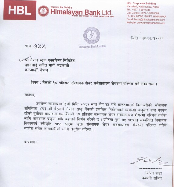 काठमाडौं । हिमालयन बैंक लिमिटेडले बैंकको १० प्रतिशत संस्थापक सेयर सर्वसाधारण सेयरमा परिणत गर्ने भएको छ । बैंक सञ्चालक समितिको चैत १५ गते बसेको बैठकको निर्णय बमोजिम नेपाल राष्ट्र बैंकको प्रचलित निर्देशनको व्यवस्था अनुसार हाल कायम रहेको पुँजीको आधारमा १० प्रतिशत संस्थापक सेयरलाई सर्वसाधारण शेयरमा परिणत गर्ने प्रक्रिया अघि बढाउने भएको हो ।