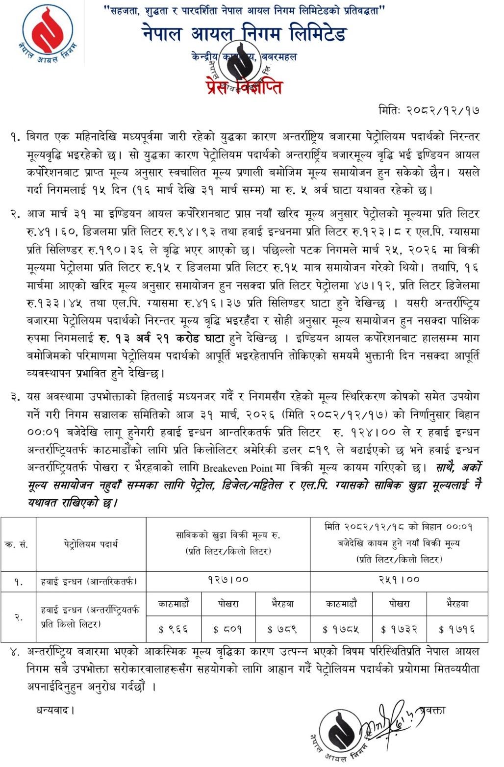 यो नयाँ मूल्य समायोजन चैत १८ गते बिहान १ बजेदेखि लागू हुने निगमले जनाएको छ । यद्यपि  आन्तरिक हवाई इन्धनको मूल्य भने घटाइएको छ । मध्यपूर्वको युद्धका कारण अन्तर्राष्ट्रिय बजारमा मूल्य वृद्धि हुँदा निगमलाई पछिल्लो १५ दिनमा २१ करोड रुपैयाँ घाटा भएको जनाएको छ ।