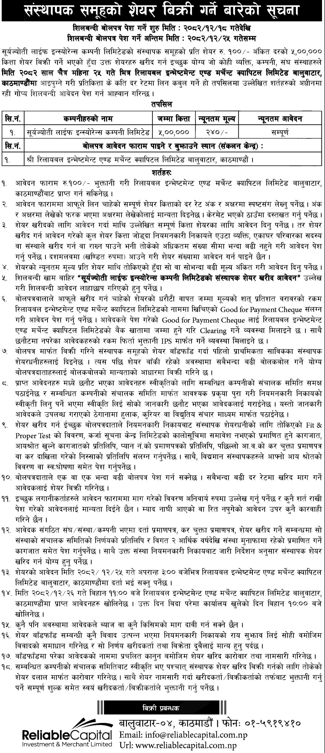 काठमाडौं । सूर्यज्योति लाइफ इन्स्योरेन्स कम्पनी लिमिटेडले संस्थापक समूहको सेयर बिक्रीमा राखेको छ । कम्पनीले संस्थापक समूह तर्फको ५ लाख कित्ता सेयर बिक्रीमा राखेको हो ।