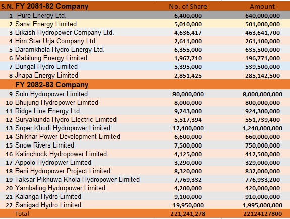इप्पानका अनुसार आर्थिक वर्ष (आव) २०८१/८२ मा ८ वटा ऊर्जा कम्पनीको ३ अर्ब ५२ करोड २६ लाख ५५ हजार २०० रुपैयाँ बराबरको ३ करोड ५२ लाख २६ हजार ५५२ कित्ता संस्थापक सेयर नेप्सेमा सूचीकृत हुन बाँकी छ । त्यसैगरी आव २०८२/८३ मा १४ कम्पनीको १८ अर्ब ६० करोड १४ लाख ७२ हजार ६०० रुपैयाँ बराबरको १८ करोड ६० लाख १४ हजार ७२६ कित्ता संस्थापक सेयर नेप्सेमा सूचीकृत हुन बाँकी रहेको छ । २२ कम्पनीको कुल २२ अर्ब १२ करोड ४१ लाख २७ हजार ८०० रुपैयाँ बराबरको २२ करोड १२ लाख ७१ हजार २७८ कित्ता संस्थापक सेयर नेप्सेमा सूचीकृत हुन बाँकी छ ।