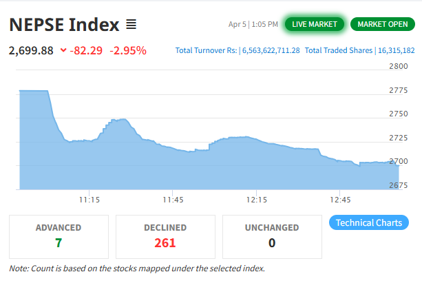 आजको कारोबार जारी हरँदा नेप्से परिसूचक ८२.२९ अंकले घटेर २७९९.८८ विन्दुमा पुगेको छ । पछिल्ला केही दिनयता विकसित घटनाक्रमले बजारको मनोविज्ञानलाई गम्भीर रूपमा प्रभावित पारेको देखिन्छ । गत साता पनि सेयर बजारमा साढे ५ प्रतिशत माथिको गिरावट आएको थियो ।