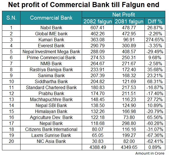 चालु आर्थिक वर्षको फागुनसम्ममा वाणिज्य बैंकहरुको नाफा गत आर्थिक वर्षको सोही अवधिको भन्दा ०.८९ प्रतिशतले वृद्धि भएको छ । अघिल्लो वर्षको फागुनसम्म बैंकहरूले ४३ अर्ब ४९ करोड ६५ लाख रुपैयाँ नाफा कमाएका थिए । नाफा आर्जनको दौडमा नबिल बैंकले आफ्नो विरासत कायम राख्दै सबैलाई पछाडि पारेको छ । नबिलले यो अवधिमा कुल ६ अर्ब ७ करोड ४१ लाख रुपैयाँ खुद नाफा कमाउँदै आफूलाई नाफाका हिसाबले सबै भन्दा अघि राख्न सफल भएको छ ।  गत वर्ष यो बैंकको नाफा ४ अर्ब ७८ करोड रुपैयाँ रहेको थियो । यो अवधिमा बैंकको नाफा २६.८७ प्रतिशतले वृद्धि भएको हो । नाफामा नबिललाई पछ्याइरहेको ग्लोबल आइएमई बैंकले यो अवधिमा ४ अर्ब ६२ करोड २६ लाख रुपैयाँ नाफा कमाए पनि उसको नाफामा गत वर्षको तुलनामा २.२६ प्रतिशतको गिरावट देखिएको छ ।