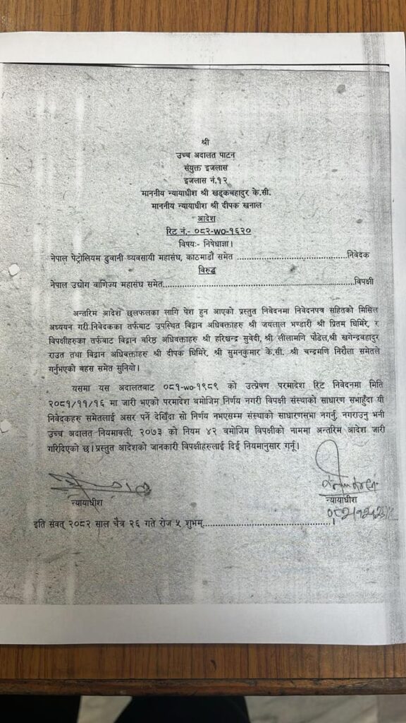 अदालतले नेपाल पेट्रोलियम ढुवानी व्यवसायी महासंघ, काठमाडौंले दायर गरेको रिटमा आदेश जारी गर्दै उक्त निर्देशन दिएको हो । पेट्रोलियम ढुवानी व्यवसायी महासंघले उद्योग वाणिज्य महासंघलाई विपक्षी बनाई रिट दायर गरेको थियो । अदालतले उक्त रिटमा फैसला गर्दै महासंघको साधारण सभा हुँदा निवेदकहरुलाई हर गर्ने हुँदा अर्को निर्णय नभएसम्म संस्थाको अर्थात् उद्योग वाणिज्य महासंघको साधारणसभा नगर्नु, नगराउनु भनि अन्तरिम आदेश जारी गरेको हो ।