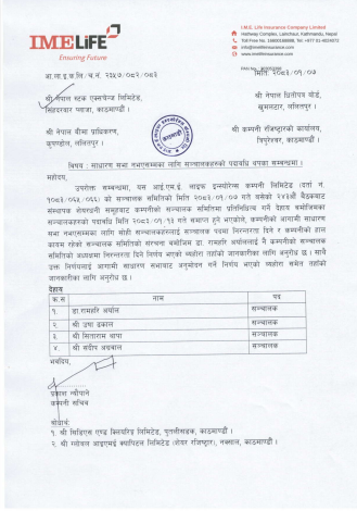 चारै जना सञ्चालकहरूको पदावधि यही वैशाख १३ गते समाप्त हुने भएकोले आगामी साधारणसभा नभएसम्म सञ्चालक पदमा निरन्तरता दिने निर्णय भएको हो। साथै हाल कायम रहेको सञ्चालक समितिको संरचना बमोजिम डा. रामहरि अर्याललाई नै सञ्चालक समितिको अध्यक्षमा निरन्तरता दिइने पनि कम्पनीले स्पष्ट पारेको छ ।