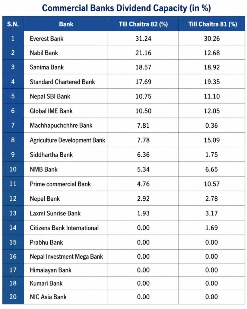 बैंकहरूले नाफाका आधारमा सेयरधनीलाई लाभांश वितरण गर्ने गर्छन्। तेस्रो त्रैमाससम्मको नतिजाले सूचीकृत बैंकमध्ये केवल ६ वटाले मात्र दोहोरो अंक (डबल डिजिट) मा लाभांश दिन सक्ने देखाएको छ। तीमध्ये एभरेष्ट बैंक सबैभन्दा अगाडि देखिन्छ, जसको लाभांश क्षमता ३१ प्रतिशतभन्दा माथि पुगेको छ। यससँगै नबिल बैंक, सानिमा बैंक, स्ट्यान्डर्ड चार्टर्ड बैंक नेपाल, नेपाल एसबीआई बैंक र ग्लोबल आइएमई बैंक पनि डबल डिजिट लाभांश दिने अवस्थामा छन्। यसबाहेक धेरै बैंकहरूको लाभांश क्षमता एकल अंकमै सीमित छ। माछापुच्छ्रे बैंक, कृषि विकास बैंक, सिद्धार्थ बैंक, एनएमबी बैंक, प्राइम कमर्सियल बैंक, नेपाल बैंक र लक्ष्मी सनराइज बैंकले १० प्रतिशतभन्दा कम लाभांश दिन सक्ने देखिन्छ।