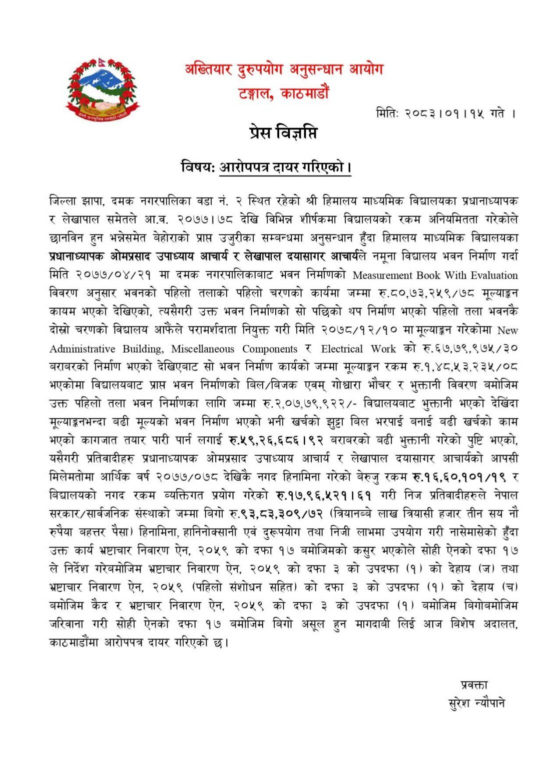 काठमाडौं । अख्तियार दुरुपयोग अनुसन्धान आयोगले झापाको दमक नगरपालिका–२ स्थित श्री हिमालय माध्यमिक विद्यालयका प्रधानाध्यापक र लेखापालविरुद्ध ९३ लाख भ्रष्टाचार गरेको आरोपमा विशेष अदालतमा मुद्दा दायर गरेको छ। आयोगका अनुसार विद्यालयका प्रधानाध्यापक ओमप्रसाद उपाध्याय आचार्य र लेखापाल दयासागर आचार्यले विद्यालय भवन निर्माणका क्रममा झुट्टा बिल भर्पाई तयार गरी सरकारी रकम हिनामिना गरेका हुन्। भवन निर्माणको प्राविधिक मूल्यांकनभन्दा ५९ लाख २६ हजार ६ सय ८६ रुपैयाँ बढी भुक्तानी लिएको देखिएको आयोगले जनाएको छ।